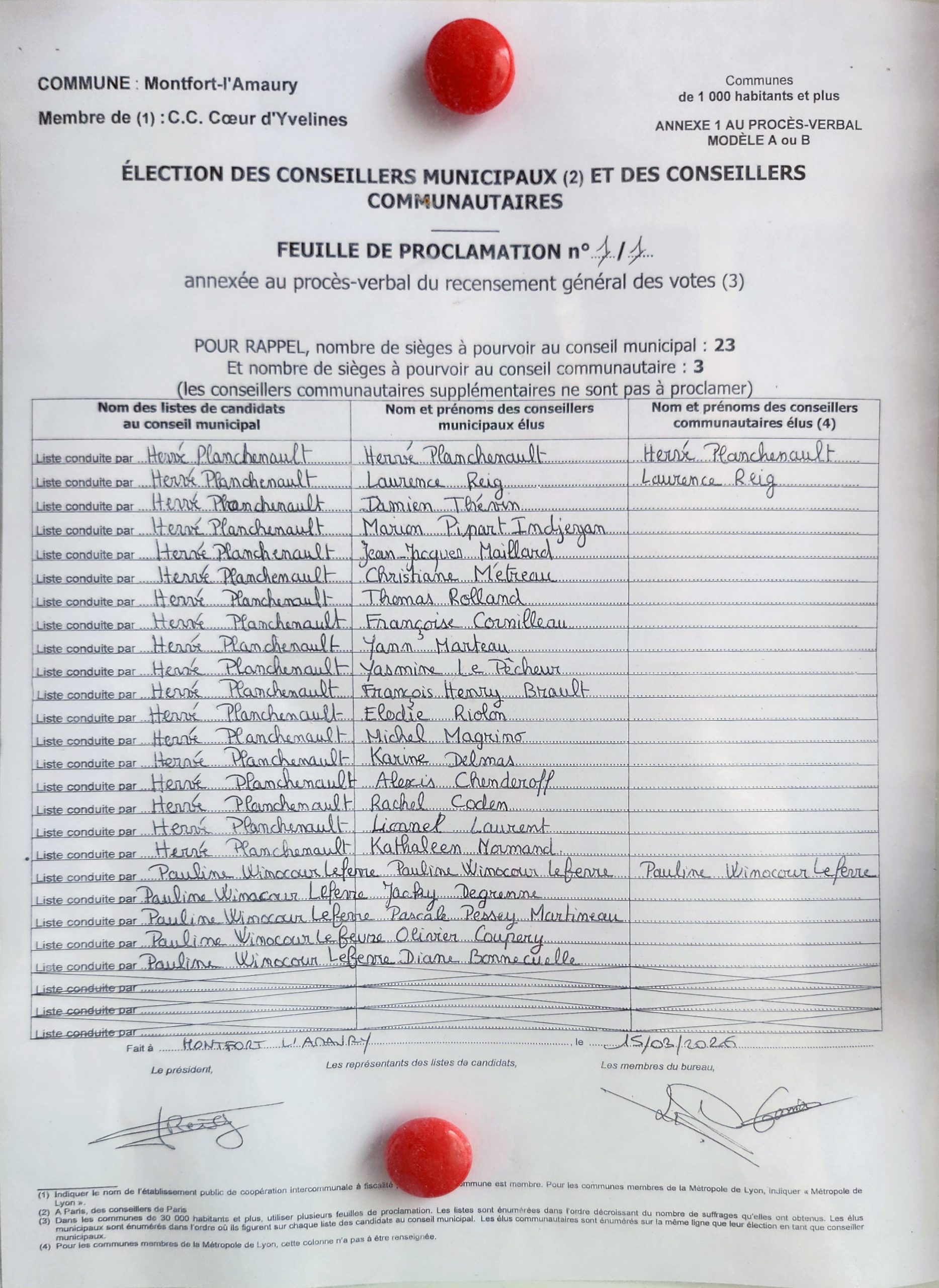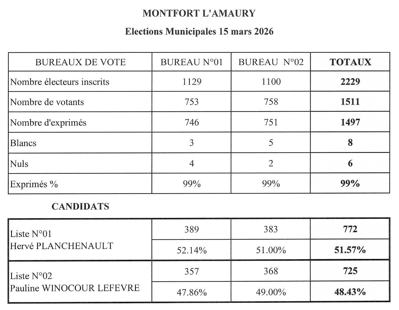 Les résultats du bureau de vote N°1 pour la commune de Montfort l’Amaury – 15 mars 2026