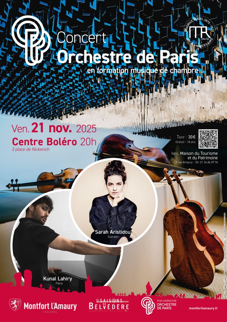 Pour clore l’année célébrant les 150 ans de la naissance de Maurice Ravel, la ville de Montfort l’Amaury et la Philharmonie de Paris accomplissent leur partenariat à travers ce concert exceptionnel. Dans la ville où le compositeur vécut – au Belvédère – et où naquirent ses chefs-d’œuvre les plus célèbres (Tzigane, L’Enfant et les Sortilèges, Boléro, les deux concertos pour piano…), les musiciens de l’Orchestre de Paris, en formation musique de chambre, retrouveront la soprano Sarah Aristidou et le pianiste Kunal Lahiry pour une soirée hommage aussi intime que prestigieuse sur le parquet du Centre Boléro.